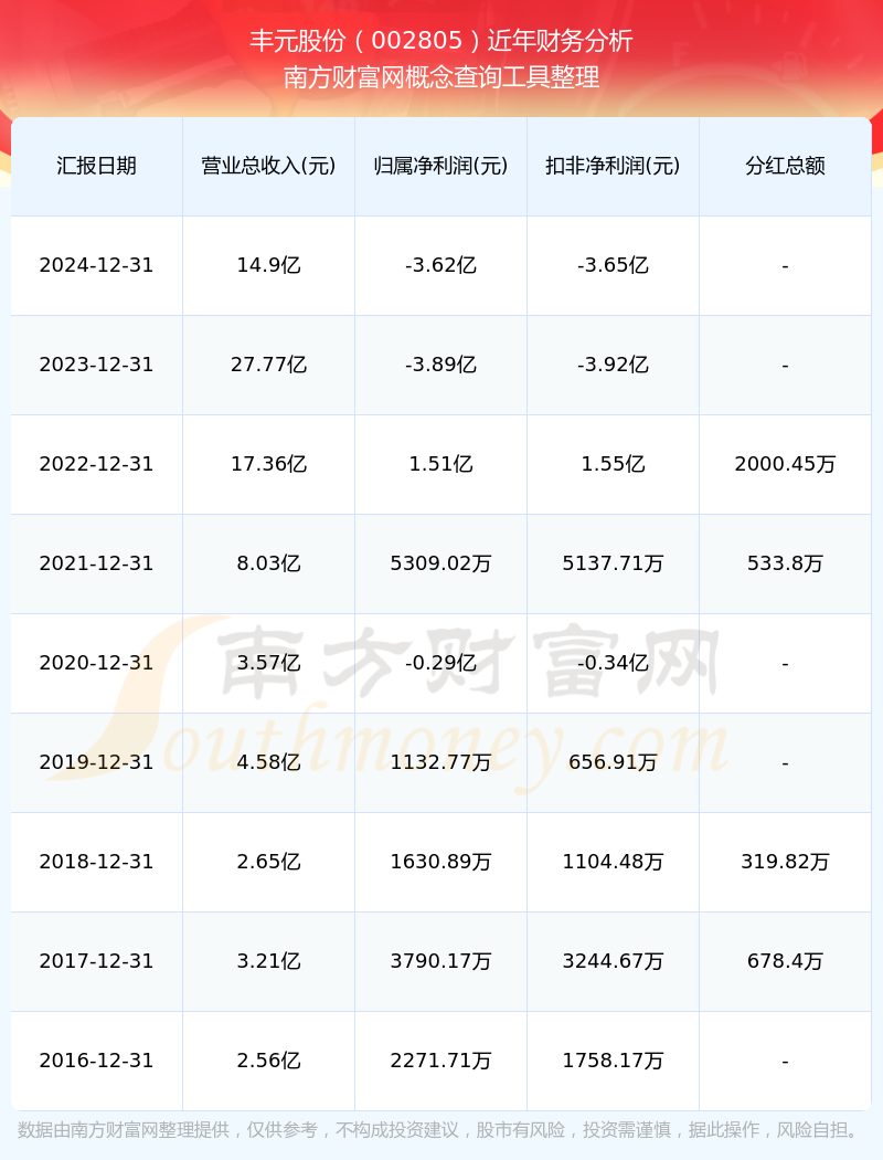 豐元股份2024年總營收14.9億,同比增長-46.35%;凈利潤-3.62億,同比增長6.96%;銷售毛利率-15.12%。