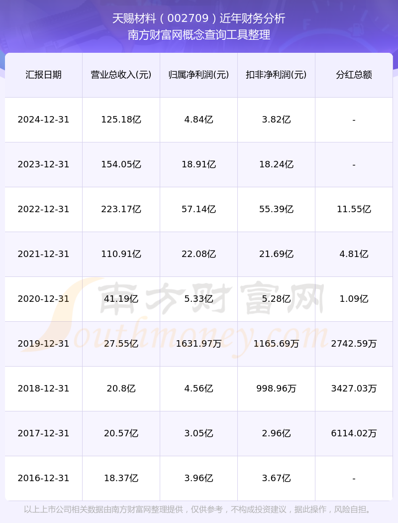 天賜材料公司2024年實(shí)現(xiàn)營(yíng)業(yè)收入125.18億元,同比增長(zhǎng)-18.74%;凈利潤(rùn)4.84億元,同比增長(zhǎng)-74.4%;毛利率18.89%。