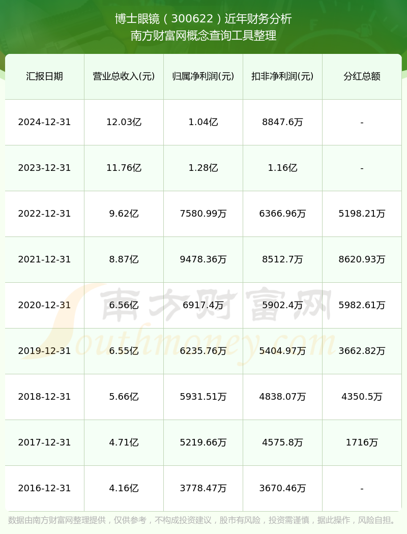 2024年報(bào)顯示,博士眼鏡實(shí)現(xiàn)營收12.03億,同比增長2.29%;凈利潤1.04億,同比增長-19.08%;毛利率61.71%。