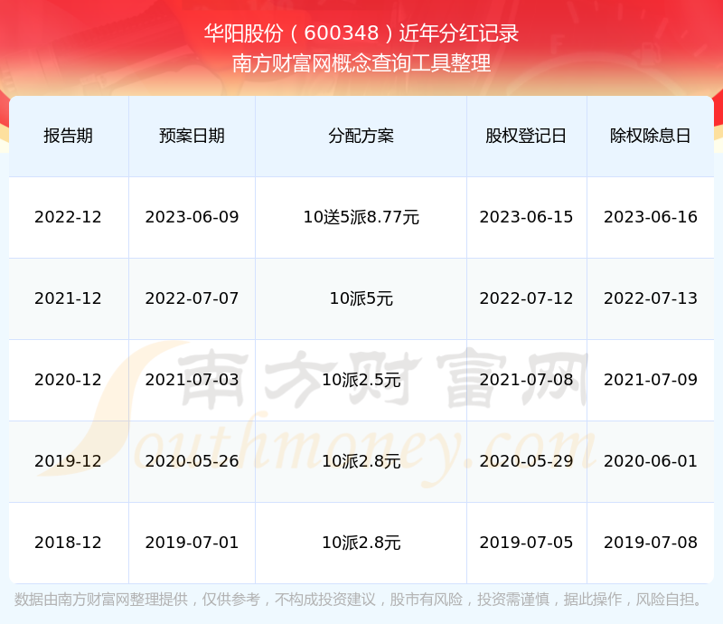 華陽股份最新一次公布的分紅方案為10送5派8.77元。本次權(quán)益分派股權(quán)登記日為2023年6月15日,除權(quán)除息日為2023年6月16日,派息日為2023年6月16日。