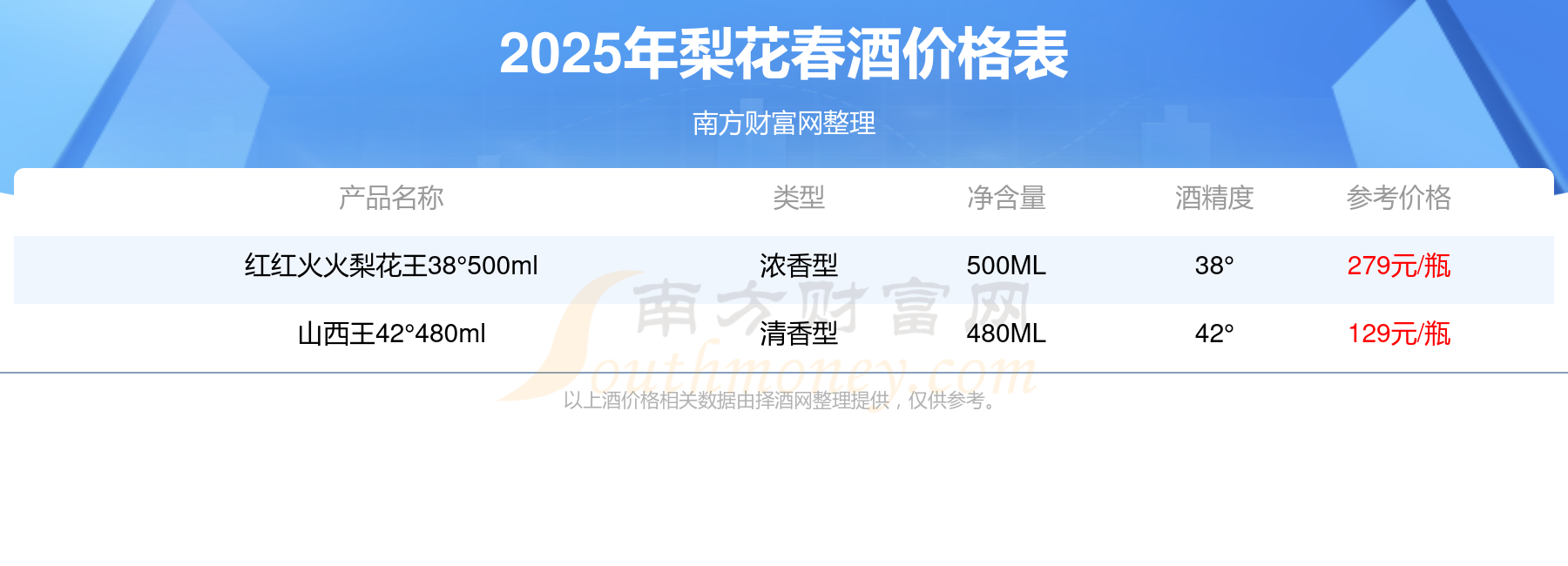 2025年梨花春酒紅紅火火梨花王38°500ml、山西王42°480ml等最新價格如下: