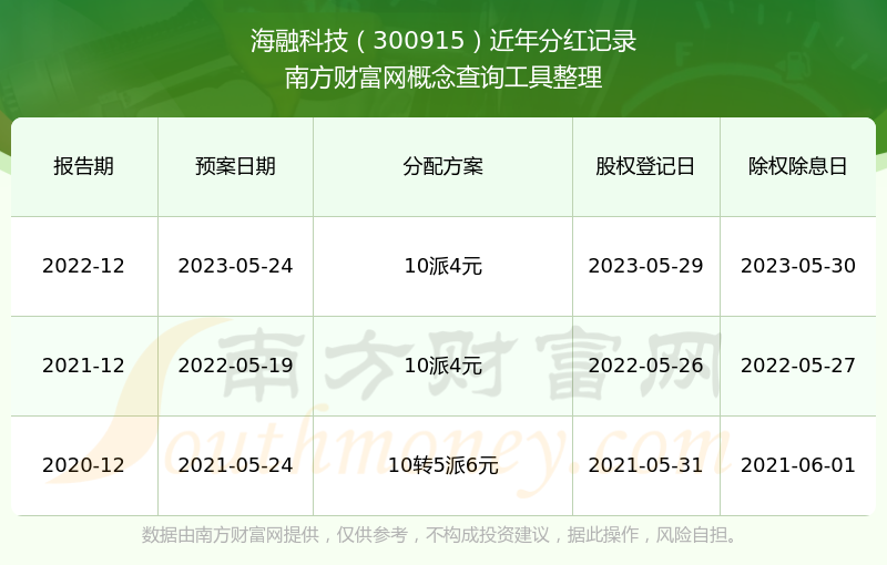海融科技最新一次公布的分紅方案為10派4元。本次權(quán)益分派股權(quán)登記日為2023年5月29日,除權(quán)除息日為2023年5月30日,派息日為2023年5月30日。