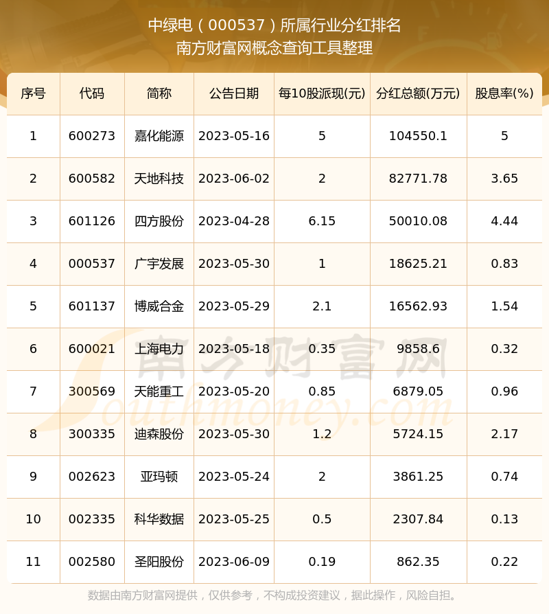 按照南方財富網(wǎng)趨勢選股系統(tǒng)統(tǒng)計,中綠電所屬行業(yè)為電力行業(yè),電力行業(yè)分紅排名情況如下表: