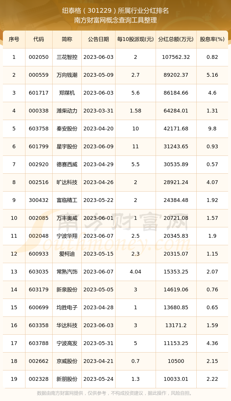 按照南方財(cái)富網(wǎng)趨勢選股系統(tǒng)統(tǒng)計(jì),紐泰格所屬行業(yè)為汽車零部件行業(yè),汽車零部件行業(yè)分紅排名情況如下表: