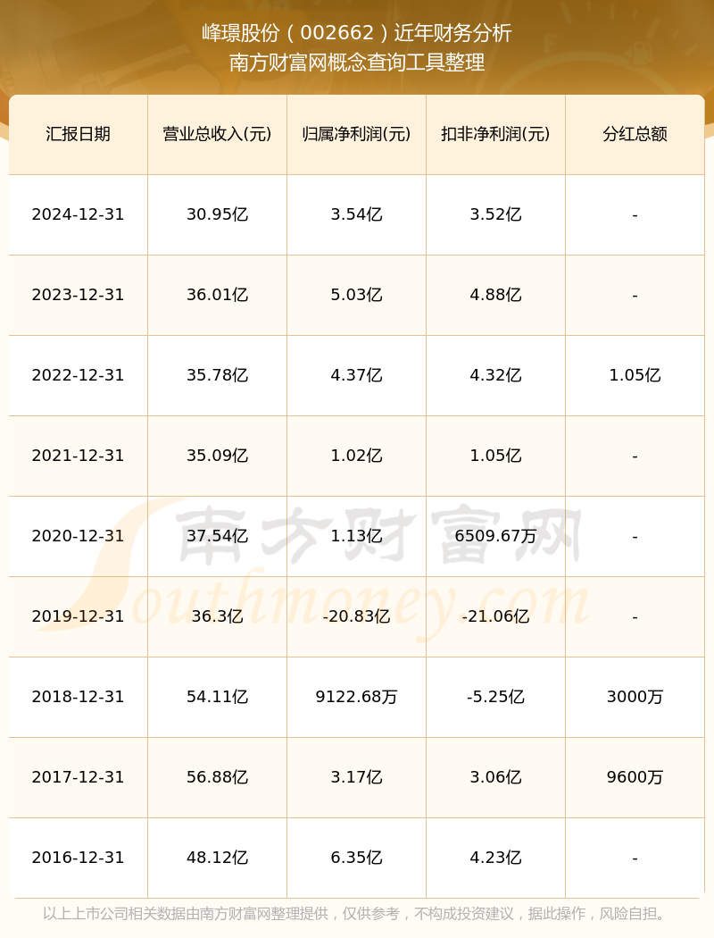 峰璟股份2024年總營收30.95億,同比增長-14.06%;凈利潤3.54億,同比增長-29.7%;銷售毛利率29.52%。