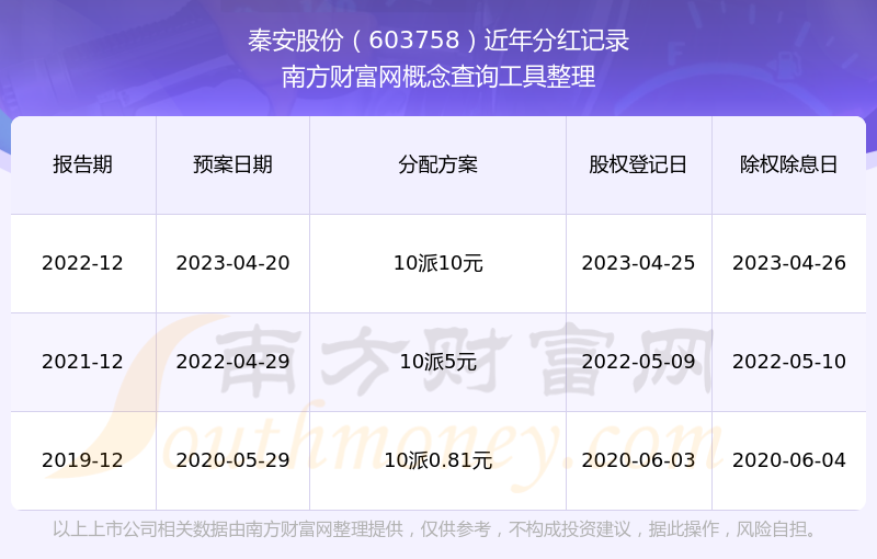 秦安股份最新一次公布的分紅方案為10派10元。本次權(quán)益分派股權(quán)登記日為2023年4月25日,除權(quán)除息日為2023年4月26日,派息日為2023年4月26日。