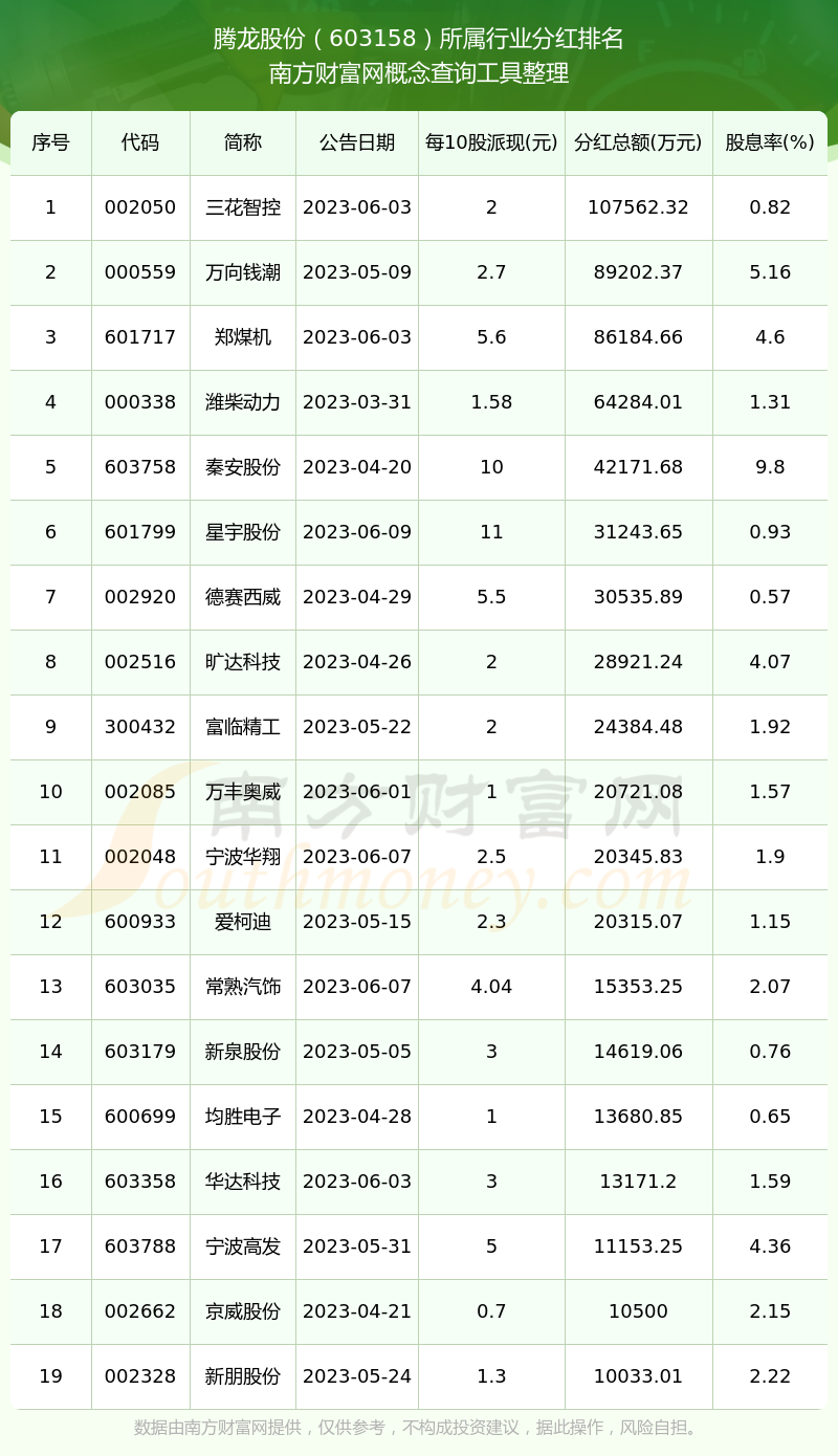 按照南方財(cái)富網(wǎng)趨勢(shì)選股系統(tǒng)統(tǒng)計(jì),騰龍股份所屬行業(yè)為汽車零部件行業(yè),汽車零部件行業(yè)分紅排名情況如下表: