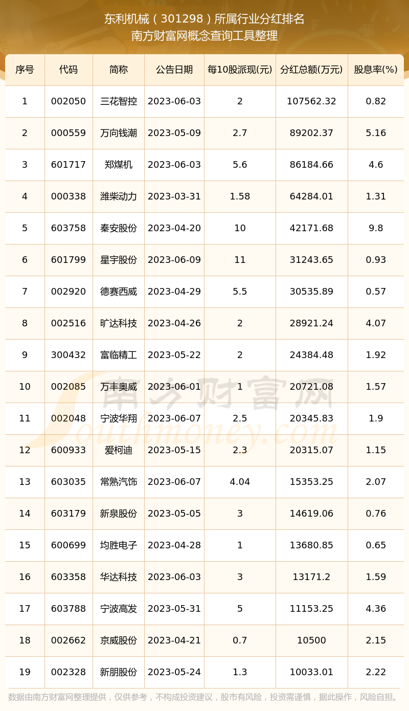 按照南方財(cái)富網(wǎng)趨勢選股系統(tǒng)統(tǒng)計(jì),東利機(jī)械所屬行業(yè)為汽車零部件行業(yè),汽車零部件行業(yè)分紅排名情況如下表: