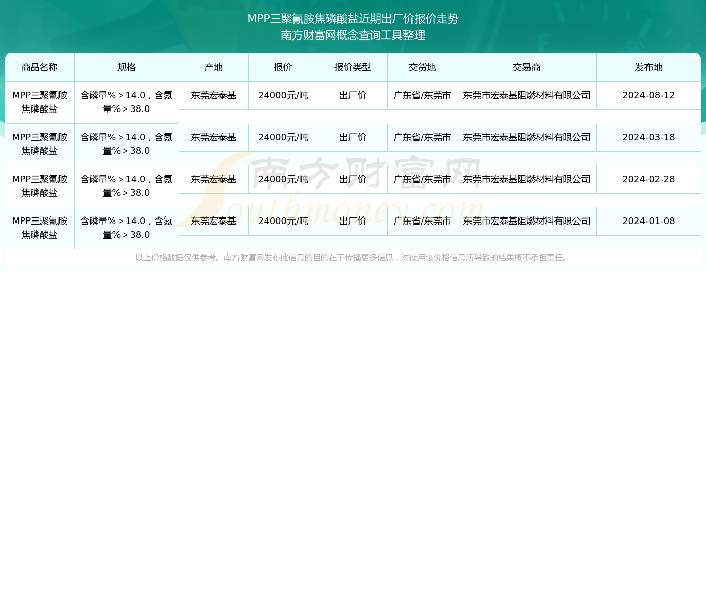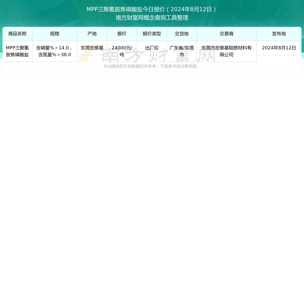 2024年8月12日,東莞市宏泰基阻燃材料有限公司MPP三聚氰胺焦磷酸鹽(含磷量%>14.0,含氮量%>38.0),東莞宏泰基,交易地點為廣東省/東莞市,出廠價報價為24000.00元/噸。