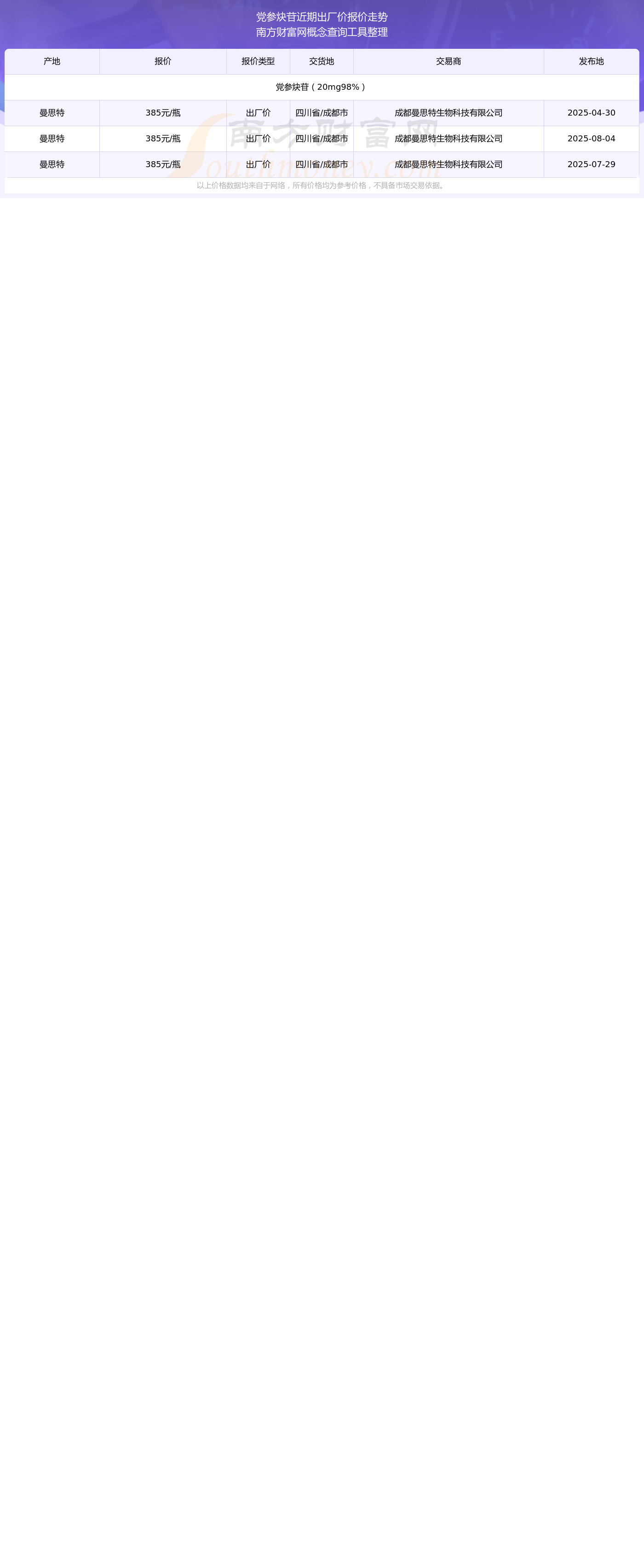 2025年8月4日,黨參炔苷(20mg98%)出廠價(jià)價(jià)格為385.00元/瓶,報(bào)價(jià)人:成都曼思特生物科技有限公司,交易地點(diǎn)為四川省/成都市。