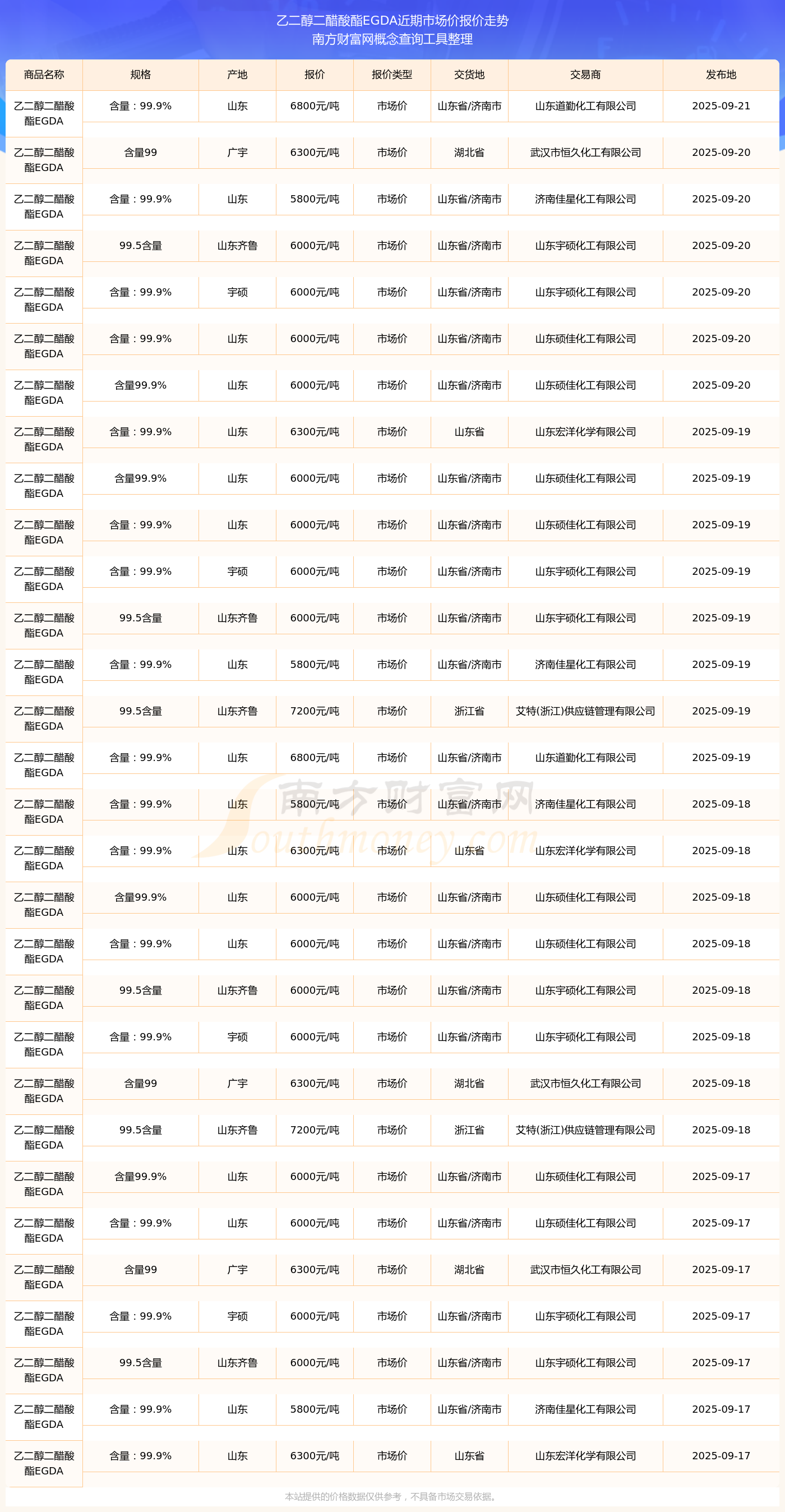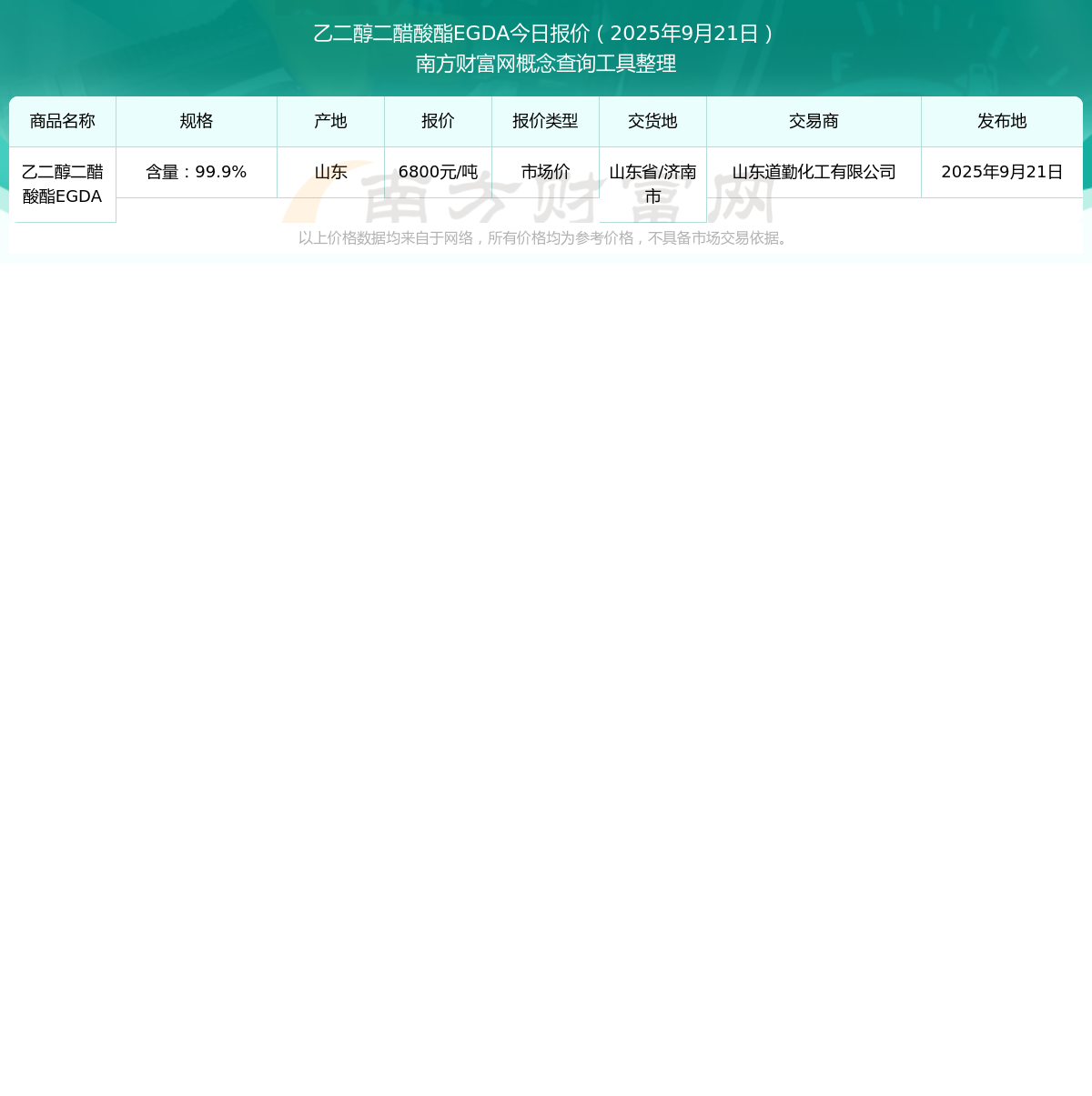 2025年9月21日,山東道勤化工有限公司乙二醇二醋酸酯EGDA(含量:99.9%),山東,交易地點為山東省/濟南市,市場價報價為6800.00元/噸。