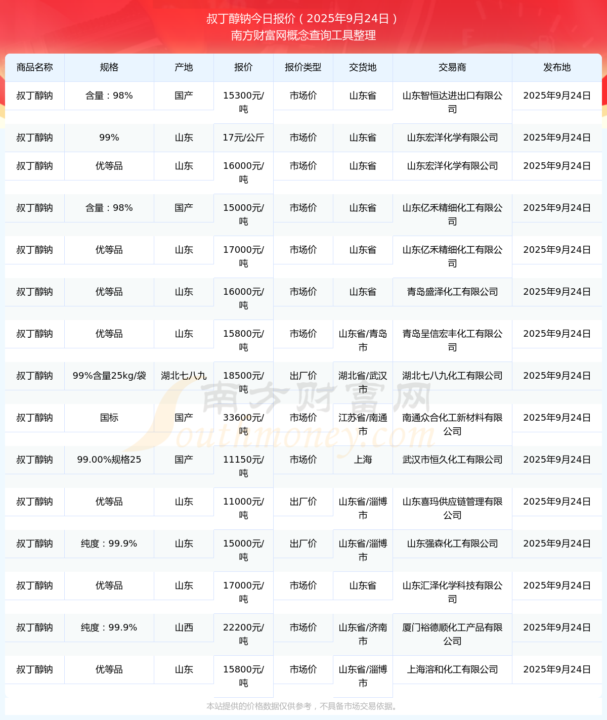 2025年9月24日,山東智恒達(dá)進(jìn)出口有限公司叔丁醇鈉(含量:98%),國(guó)產(chǎn),交易地點(diǎn)為山東省,報(bào)價(jià)為15300.00元/噸。