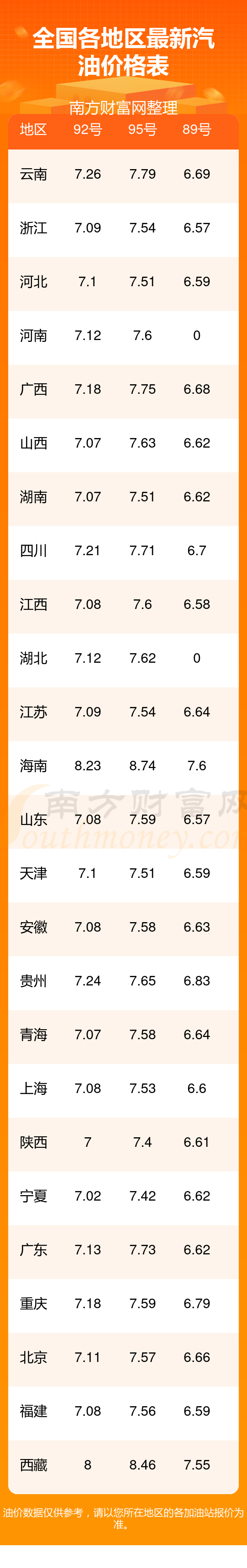 油價(jià)數(shù)據(jù)僅供參考,請以您所在地區(qū)的加油站報(bào)價(jià)為準(zhǔn)。南方財(cái)富網(wǎng)發(fā)布此信息的目的在于傳播更多信息,對使用該油價(jià)信息所導(dǎo)致的結(jié)果概不承擔(dān)任何責(zé)任。