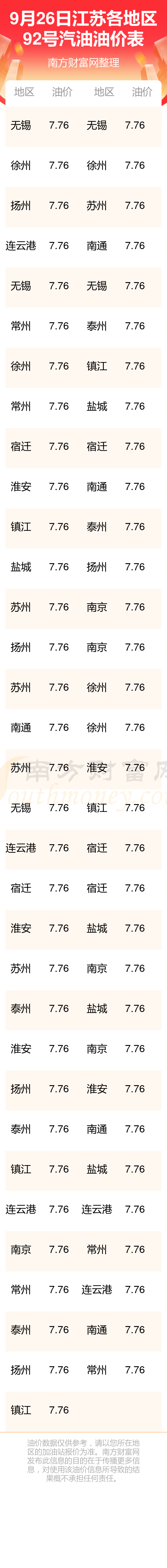2025年9月26日江蘇92號汽油最新價格一覽表