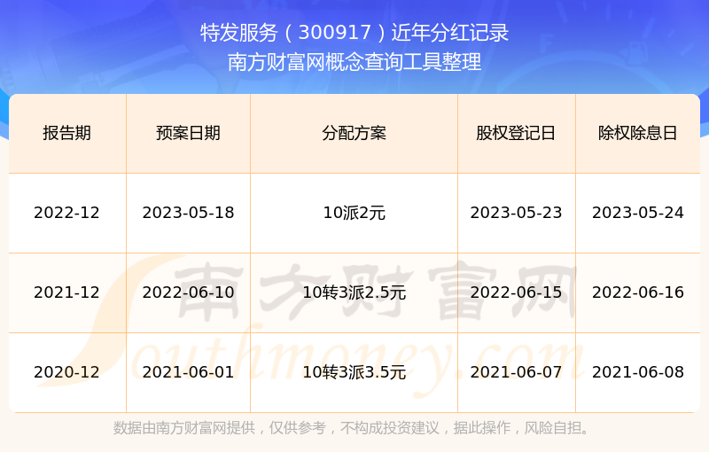 特發(fā)服務(wù)最新一次公布的分紅方案為10派2元。本次權(quán)益分派股權(quán)登記日為2023年5月23日,除權(quán)除息日為2023年5月24日,派息日為2023年5月24日。