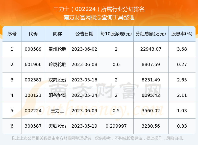 按照南方財(cái)富網(wǎng)趨勢(shì)選股系統(tǒng)統(tǒng)計(jì),三力士所屬行業(yè)為橡膠V帶行業(yè),橡膠V帶行業(yè)分紅排名情況如下表: