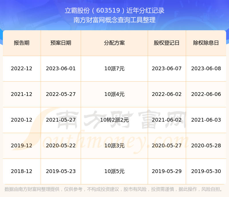 立霸股份最新一次公布的分紅方案為10派7元。本次權(quán)益分派股權(quán)登記日為2023年6月7日,除權(quán)除息日為2023年6月8日,派息日為2023年6月8日。