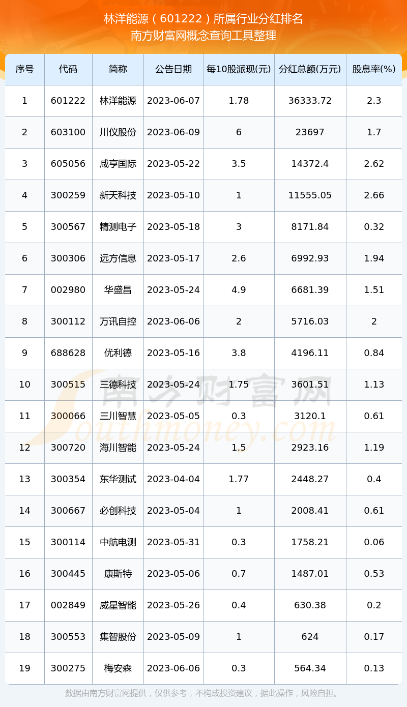 按照南方財(cái)富網(wǎng)趨勢(shì)選股系統(tǒng)統(tǒng)計(jì),林洋能源所屬行業(yè)為電能表行業(yè),電能表行業(yè)分紅排名情況如下表: