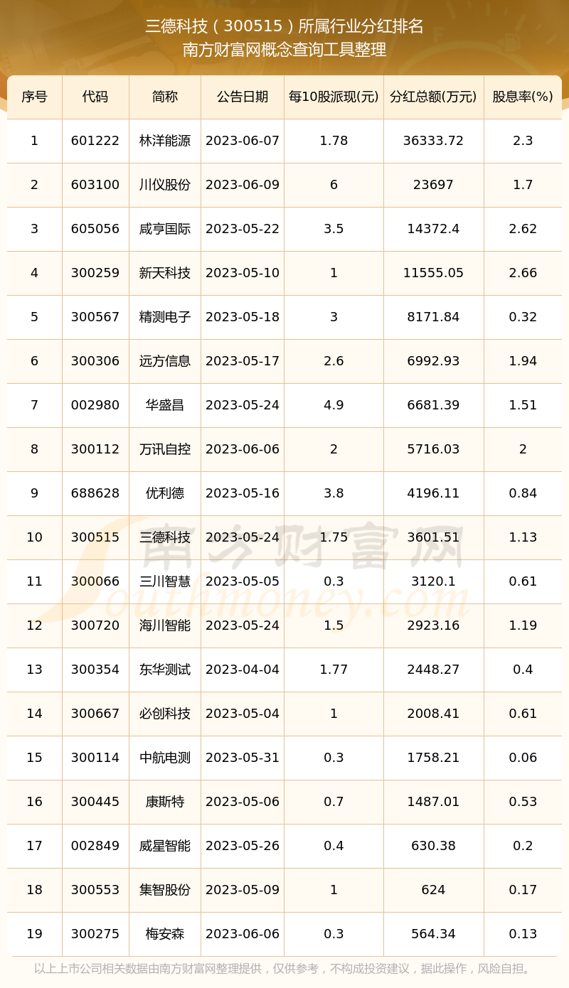 按照南方財富網(wǎng)趨勢選股系統(tǒng)統(tǒng)計,三德科技所屬行業(yè)為儀器儀表行業(yè),儀器儀表行業(yè)分紅排名情況如下表:
