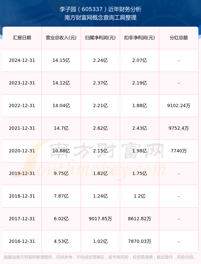 2024年報(bào)顯示,李子園實(shí)現(xiàn)營(yíng)收14.15億,同比增長(zhǎng)0.22%;凈利潤(rùn)2.24億,同比增長(zhǎng)-5.55%;毛利率39.08%。