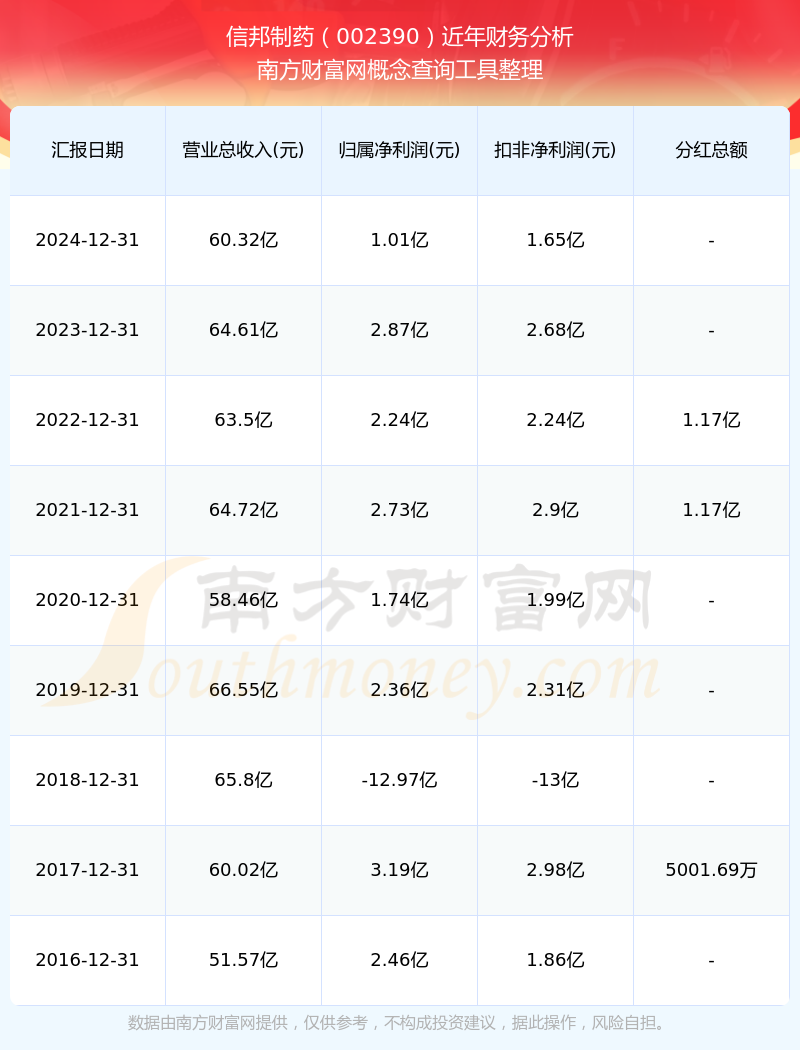 信邦制藥歷年分紅派息情況如下表所示: