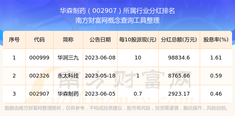 按照南方財富網(wǎng)趨勢選股系統(tǒng)統(tǒng)計,華森制藥所屬行業(yè)為醫(yī)藥行業(yè),醫(yī)藥行業(yè)分紅排名情況如下表: