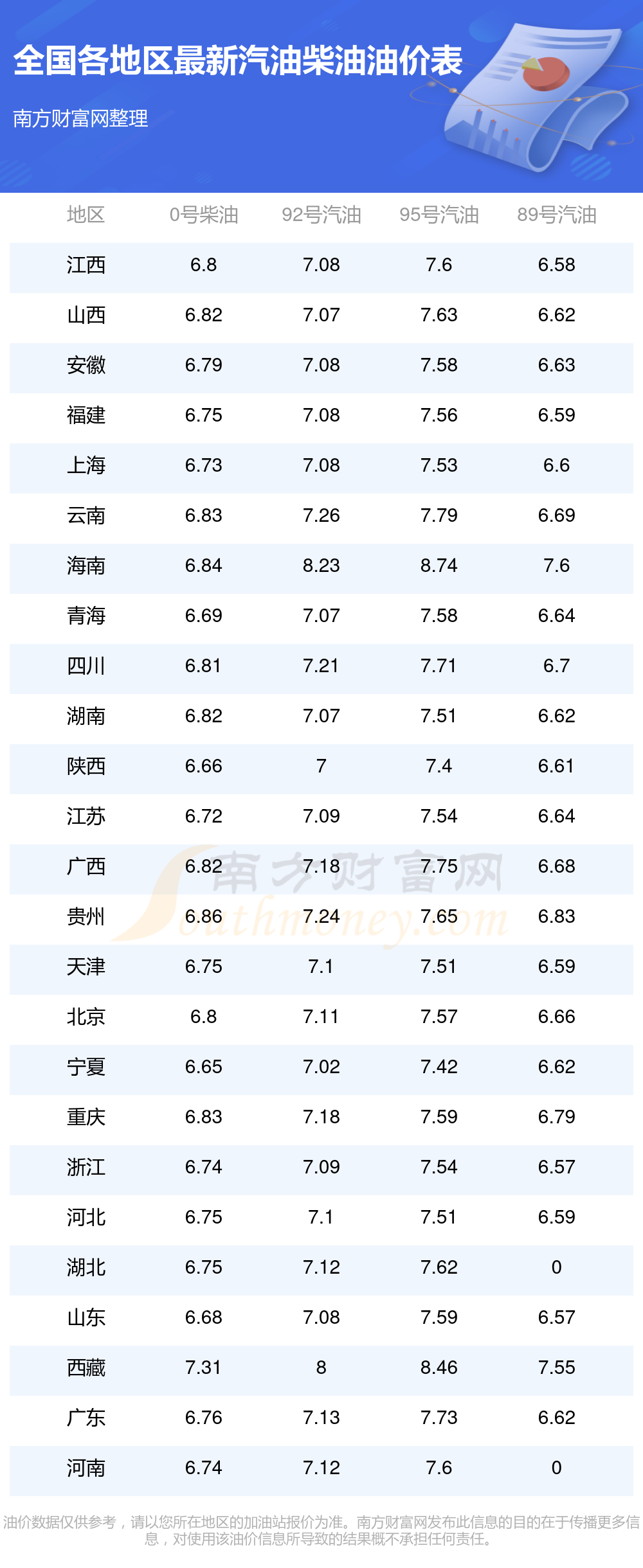 油價調(diào)整最新消息:本次油價的調(diào)整時間為8月27日,調(diào)整后全國92號汽油平均價格為7元每升,其中,最低的是陜西,7.00元每升,最高的是海南,8.23元每升。全國95號汽油平均價格為8元每升,其中,最低的是陜西,7.40元每升,最高的是海南,8.74元每升。全國0號柴油平均價格為:7元每升,其中,最低的是寧夏,6.65元每升,最高的是西藏,7.31元每升。全國89號汽油平均價格為7元每升,其中,最低的是浙江,6.57元每升,最高的是海南,7.60元每升。下一輪汽油價格調(diào)整時間10月13日24時,距離現(xiàn)在還有17.96天。