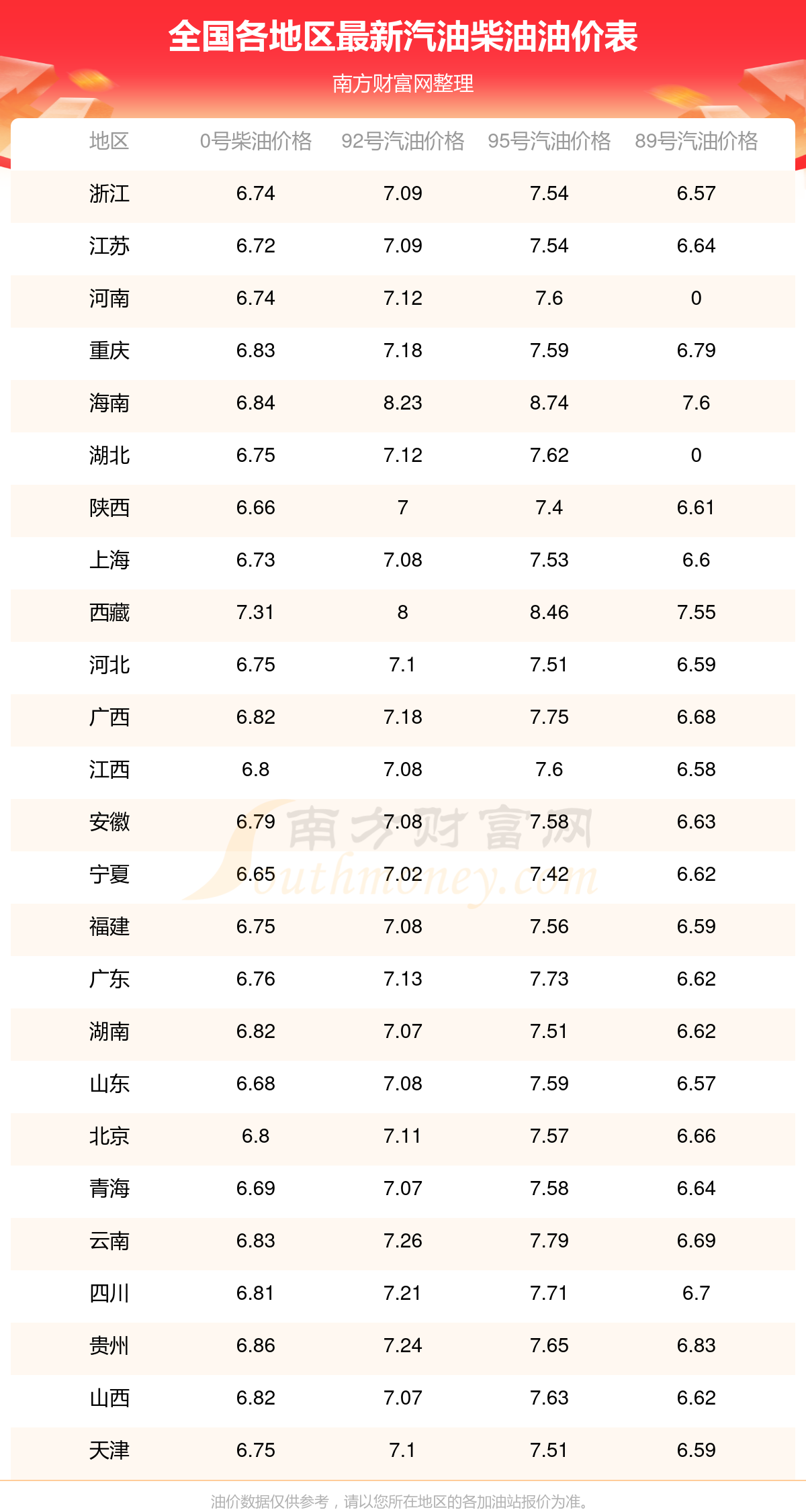 全國(guó)89號(hào)汽油平均價(jià)格為:7元每升,其中,最低為浙江,價(jià)格6.57元/升,最高為海南,價(jià)格7.60元/升。