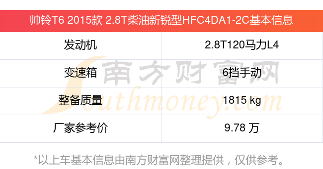 帥鈴T6 2015款 2.8T柴油新銳型HFC4DA1-2C動(dòng)力方面,搭載的是一臺(tái)2.8T120馬力L4渦輪增壓發(fā)動(dòng)機(jī),匹配6擋手動(dòng)擋變速箱,燃料形式為柴油,常規(guī)整備質(zhì)量1815kg,廠家參考價(jià)9.78萬(wàn)元。