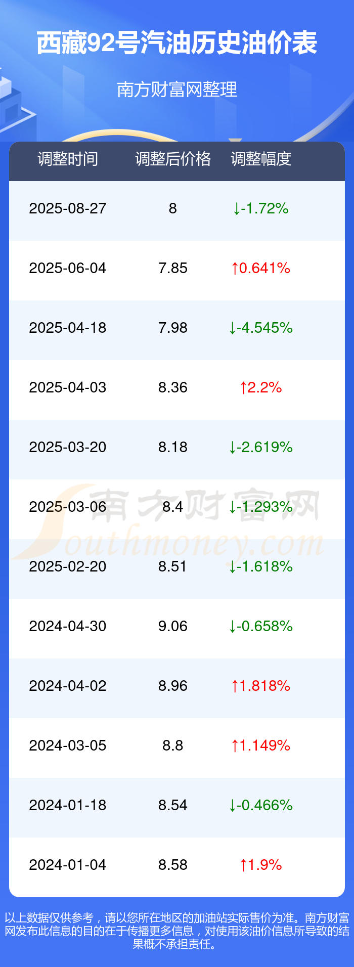9月30日西藏92號汽油的價格是8月27日調(diào)整后的價格,為8元/升,6月4日為上一輪油價調(diào)整時間,上次調(diào)整后西藏92號汽油價格為8.14元/升,本次相比下跌了0.14元,下跌幅為1.72%。