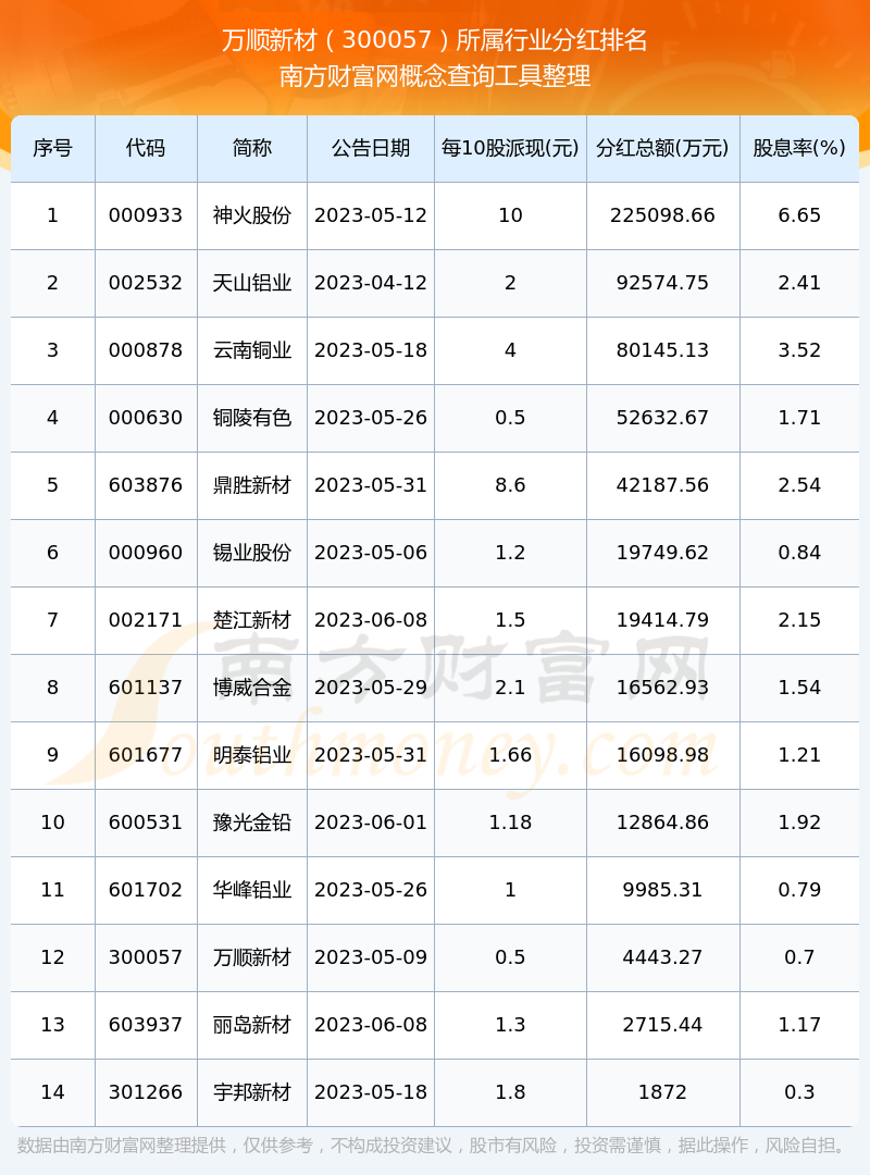 按照南方財(cái)富網(wǎng)趨勢(shì)選股系統(tǒng)統(tǒng)計(jì),萬(wàn)順新材所屬行業(yè)為鋁加工行業(yè),鋁加工行業(yè)分紅排名情況如下表: