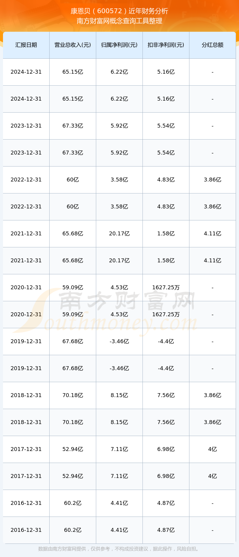 康恩貝歷年分紅派息情況如下表所示: